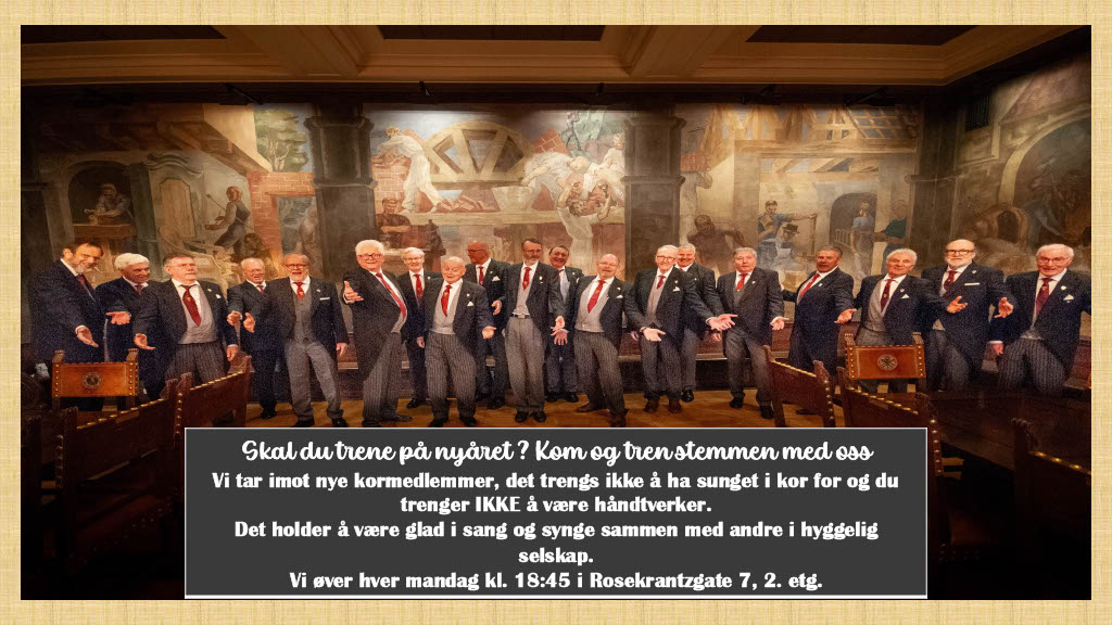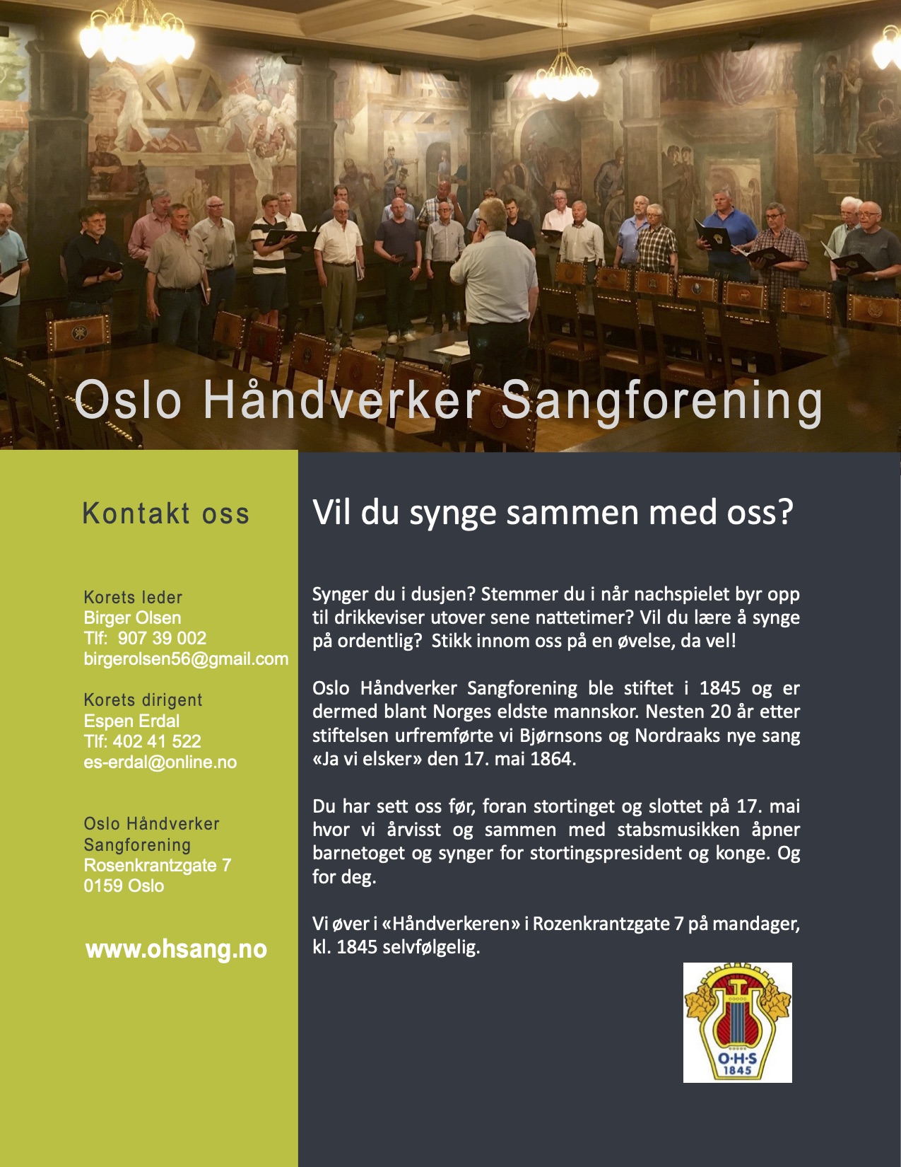 Vil du synge sammen med oss? Synger du i dusjen? Stemmer du i når nachspielet byr opp til drikkeviser utover sene nattetimer? Vil du lære å synge på ordentlig? Stikk innom oss på en øvelse, da vel! Oslo Håndverker Sangforening ble stiftet i 1845 og er dermed blant Norges eldste mannskor. Nesten 20 år etter stiftelsen urfremførte vi Bjørnsons og Nordraaks nye sang «Ja vi elsker» den 17. mai 1864. Du har sett oss før, foran stortinget og slottet på 17. mai hvor vi årvisst og sammen med stabsmusikken åpner barnetoget og synger for stortingspresident og konge. Og for deg. Vi øver i «Håndverkeren» i Rozenkrantzgate 7 på mandager, kl. 1845 selvfølgelig.
